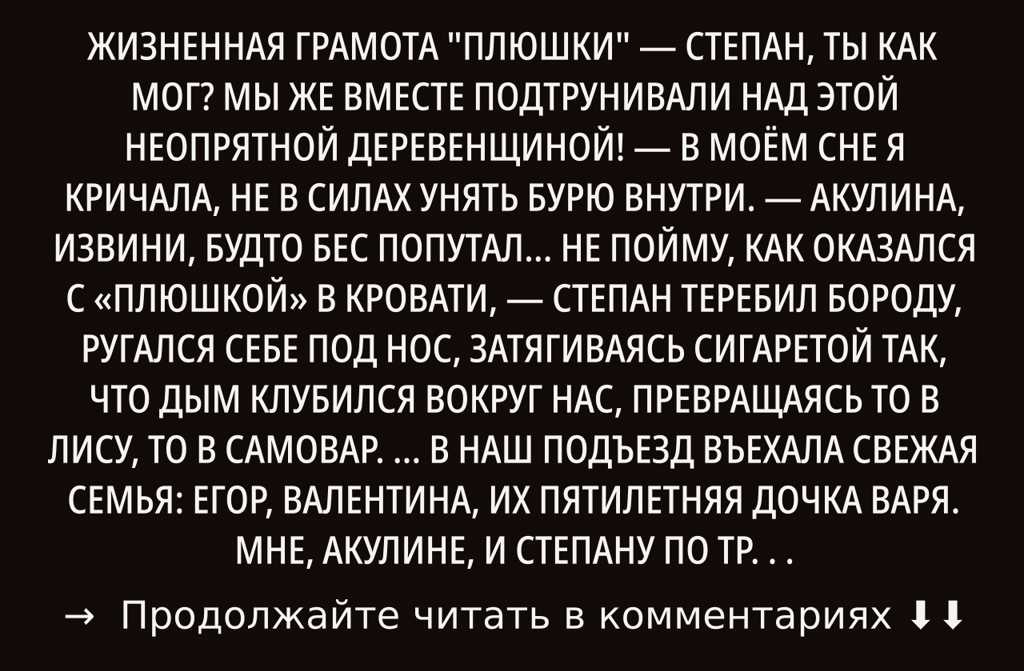 Акулина, извини, будто бес попутал Не пойму, как оказался с «Плюшкой» в кровати, Степан теребил бороду, ругался себе под нос, затягиваясь сигаретой так, что дым клубился вокруг нас, превращаясь то в лису, то в самовар.