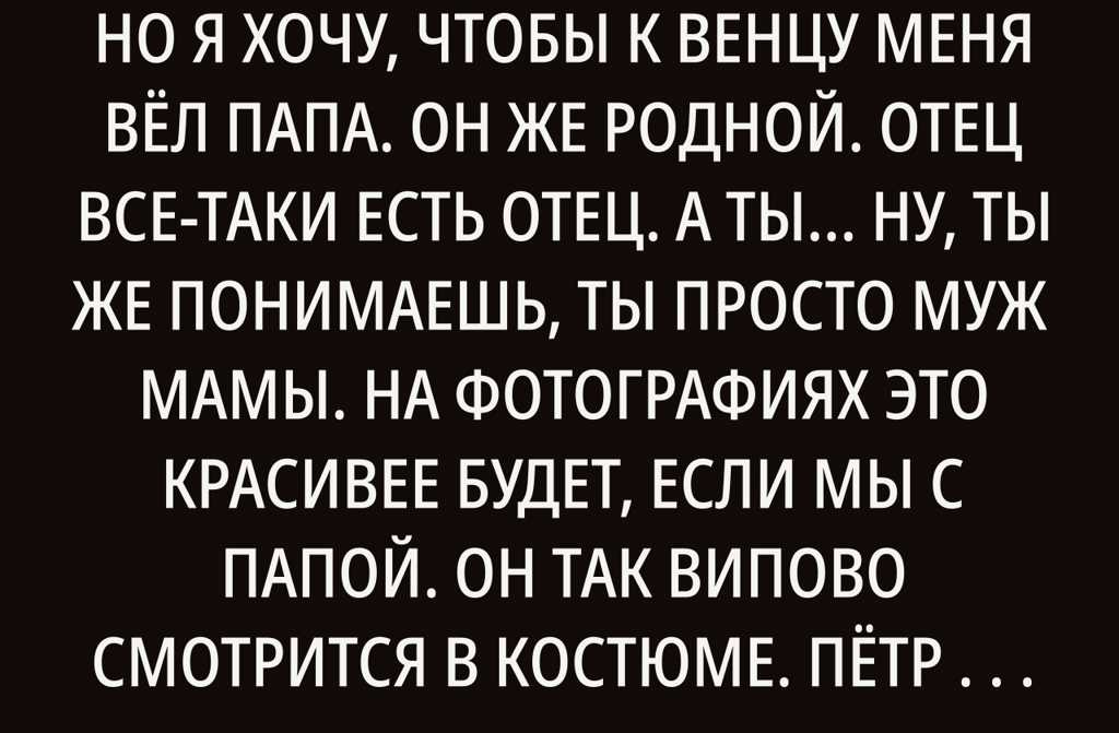 ПЕТЯ, ТЫ ТОЛЬКО НЕ ОБИЖАЙСЯ. НО Я ХОЧУ, ЧТОБЫ К ВЕНЦУ МЕНЯ ВЁЛ ПАПА. ОН ЖЕ РОДНОЙ. ОТЕЦ ВСЕ-ТАКИ ЕСТЬ ОТЕЦ. А ТЫ… НУ, ТЫ ЖЕ ПОНИМАЕШЬ, ТЫ ПРОСТО МУЖ МАМЫ. НА ФОТОГРАФИЯХ ЭТО КРАСИВЕЕ БУДЕТ, ЕСЛИ МЫ С ПАПОЙ. ОН ТАК ВИПОВО СМОТРИТСЯ В КОСТЮМЕ.