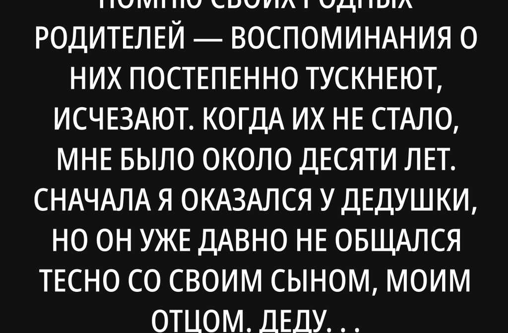 С каждым годом я всё меньше помню своих родных родителей воспоминания о них постепенно тускнеют, исчезают. Когда их не стало, мне было около десяти лет. Сначала я оказался у дедушки, но он уже давно не общался тесно со своим сыном, моим отцом. Дедушка почти меня не знал, и воспитание мне давалось ему нелегко, как я понимаю теперь, поэтому он отказался меня растить и определил в детский дом.