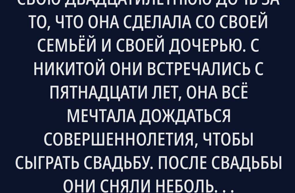 Я не могу перестать осуждать свою двадцатилетнюю дочь за то, что она сделала со своей семьёй и своей дочерью. С Никитой они встречались с пятнадцати лет, она всё мечтала дождаться совершеннолетия, чтобы сыграть свадьбу. После свадьбы они сняли небольшую квартиру в центре Киева, где молодая пара наконец смогла начать самостоятельную жизнь. В начале им приходилось жить весьма скромно: оба только поступили в университеты и работали на полставки она продавцом в магазине, он официантом. Потом Никита устроился помощником риэлтора и начал зарабатывать больше гривен. В том же году они узнали, что ждут ребёнка.