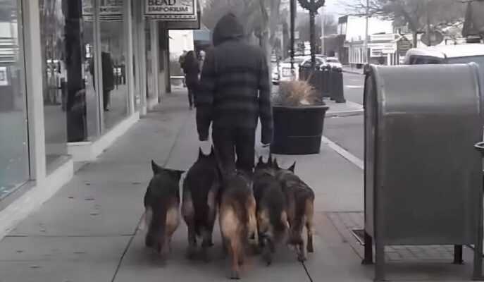 A prima vista sembra che l’uomo stia semplicemente portando a spasso i suoi cani – ma la realtà è molto più inquietante.